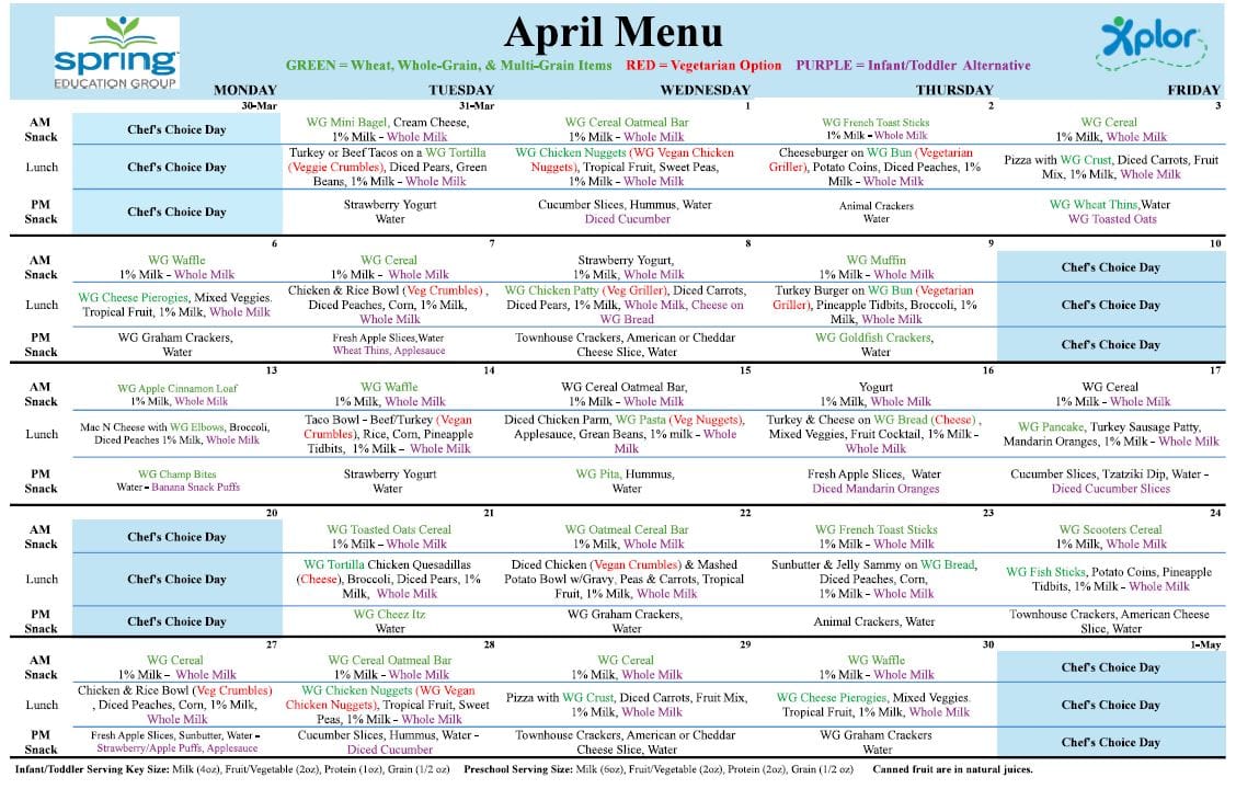 Calendars & Menu Home / For Parents / Calendars & Menu Yearly Calendar April Menu March JanuaryFebruaryMarchAprilMayJuneJulyAugustSeptemberOctoberNovemberDecember 2026 202520262027 Sunday Monday Tuesday Wednesday Thursday Friday Saturday 1 Sunday, March 1, 2026 2 Monday, March 2, 2026 Dr Suess Spirit Week – Fox In Socks – 3 Tuesday, March 3, 2026 Dr Suess Spirit Week – Cat In Hat – National Anthem Day – 4 Wednesday, March 4, 2026 Dr Suess Spirit Week – Silly Fish 5 Thursday, March 5, 2026 Dr Suess Spirit Week – Thing One And Thing Two 6 Friday, March 6, 2026 Dr Suess Spirit Week – Oh The Places You’ll Go – 7 Saturday, March 7, 2026 8 Sunday, March 8, 2026 9 Monday, March 9, 2026 10 Tuesday, March 10, 2026 11 Wednesday, March 11, 2026 12 Thursday, March 12, 2026 13 Friday, March 13, 2026 14 Saturday, March 14, 2026 15 Sunday, March 15, 2026 16 Monday, March 16, 2026 St. Patrick’s Day Spirit Week- Lucky Green Day – Spring Camp for School Age – 17 Tuesday, March 17, 2026 St. Patrick’s Day Spirit Week- Leprechaun Day – 18 Wednesday, March 18, 2026 St. Patrick’s Day Spirit Week- Green Hat Day – 19 Thursday, March 19, 2026 Open House – St. Patrick’s Day Spirit Week- Lucky Socks Day – 20 Friday, March 20, 2026 St. Patrick’s Day Spirit Week- Gold Day Last Day of Spring Camp 21 Saturday, March 21, 2026 Open House 22 Sunday, March 22, 2026 23 Monday, March 23, 2026 24 Tuesday, March 24, 2026 25 Wednesday, March 25, 2026 26 Thursday, March 26, 2026 27 Friday, March 27, 2026 28 Saturday, March 28, 2026 29 Sunday, March 29, 2026 30 Monday, March 30, 2026 Spring Spirit Week- Bunny Day! – 31 Tuesday, March 31, 2026 Spring Spirit Week- Pastel Palette Day – X Export Calendar Export Entire Calendar Start Date End Date Export Format iCal Download